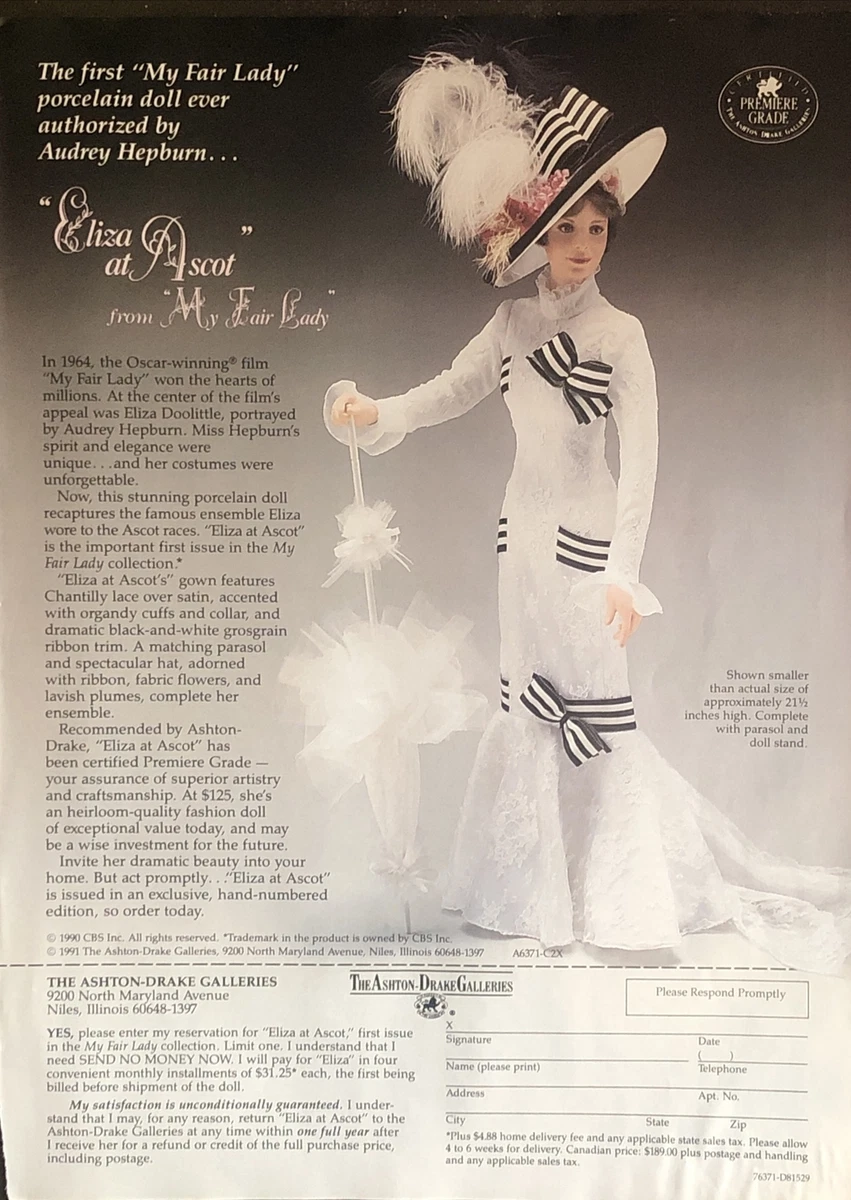 - ↑ «Vintage 1987 Audrey Hepburn "Eliza Doolittle" Doll From My Fair Lady 31.5" Tall By Marilyn Houchen Signed Numbered Ascot». rubylane.com.