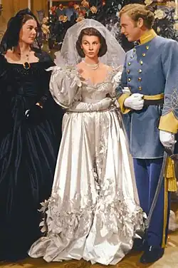 Debido a que Ellen tiene 32 años al inicio de la historia y su boda con Gerald tuvo lugar cuando contaba con apenas 15 años, teniendo en cuenta que el libro comienza en 1861, Ellen debió contraer matrimonio en 1843 o 1844, detalle de gran importancia que Plunkett trasladó a la pantalla recreando un vestido anticuado para los estándares de principios de la década de 1860.[12] A mayores, con el fin de incrementar el grado de fidelidad a la novela, el diseñador, conocido por su obsesión por la perfección, elaboró intencionadamente el vestido basándose en las medidas de Barbara O'Neil, quien interpretó a Ellen, motivo por el que el traje no se ajustaba al cuerpo de Leigh,[5] a quien el vestido le quedaba grande debido a que era más baja y menos corpulenta que O'Neil.[13][nota 1] Sumado a esto, el hecho de que el blanco sea el color tradicional de los atuendos nupciales es la causa de que el traje no se ajuste a los códigos impuestos por Plunkett, pues en la secuencia de la boda Scarlett, mediante un sutil movimiento de cabeza y una leve sonrisa, trata de que Ashley la bese con ternura en un último y desesperado intento por llamar su atención. Plunkett se vio limitado sin embargo por el Technicolor tal y como declaró Selznick: «Sé por hablar con Walter Plunkett que nadie se siente tan mal como él por las limitaciones que le han impuesto. Pero si vamos a escuchar completamente a los expertos en Technicolor, también podríamos eliminar por completo a los artistas que están en nuestros propios departamentos de decorado y vestuario y dejar que la compañía Technicolor diseñe la película para nosotros».[10]: 166 A esto se sumó la problemática del coste, pues el presupuesto original del guardarropa era de $80 000, cifra que terminaría aumentando a $157 000 para el final del rodaje, costando las labores de lavandería más de $10 000 debido a que las prendas necesitaban ser limpiadas a diario;[14]: 10 Selznick se encargó de dar gran publicidad al vestuario del filme asegurando que era el más caro jamás creado para una película, lo que perjudicaría seriamente a Plunkett:[9]: 194–195
