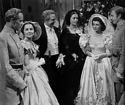 - ↑ Cabe destacar que para el rodaje de la escena, con el fin de que los actores pudiesen estar más cerca unos de otros, se hizo necesario retirar los miriñaques de todos los vestidos, motivo por el que las faldas se ven planas y sin vuelo.