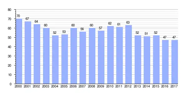 | Gráfica de evolución demográfica de Viñayo[2] entre 2000 y 2017 |