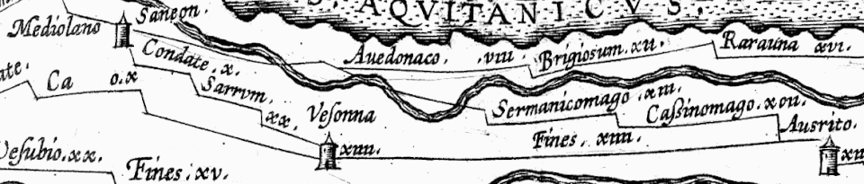 La distancia entre Mediolanum Santonum (Saintes) y Avedonacum (Aulnay) es desconocida así como entre Avedonacum y Sermanicomagus; la distancia entre Sermanicomagus a Cassinomagus (Chassenon) es conocida y mide 13 leguas y 17 leguas entre Cassinomagus y Augustoritum (Limoges) lo que permite localizar, más o menos y a pesar de los errores, cada una de estas etapas ya que, según Jacques Dassie debe decir: