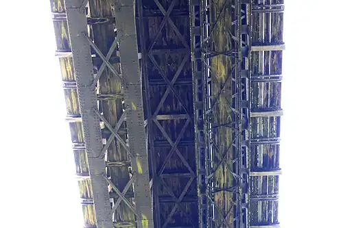 En realidad, la estructura está formada por dos viaductos, situados uno al lado del otro. Cada viaducto consta de seis tramos de 90 pies (27,4 m) de luz, unidos por un par de vigas Warren en los centros de 5 pies (1,5 m), que están soportados por cinco caballetes también de celosía.[1][7] Cuando se amplió el viaducto original para permitir alojar la vía doble, se erigió un segundo viaducto[21] de construcción casi idéntica en su lado sureste, a 7 pies 6 pulgadas (2,3 m) del puente original, con el espacio entre ambos cubierto por una serie de elementos de arriostramiento y una cubierta de madera.[1][7] El nuevo viaducto alojó la vía utilizada por los trenes procedentes de Londres. Las celosías tienen un canto de 9 pies 4 pulgadas (2,8 m).[7] Los elementos inferiores (a tracción) de cada celosía nueva incluyen una placa continua en su parte inferior para incrementar la resistencia del conjunto. Los caballetes varían en altura desde 48 pies (14,6 m) a 120 pies (36,6 m); cada uno está construido con cuatro columnas conectadas por arriostramientos horizontales y diagonales. Cada columna está hecha de un número variable de secciones, de extremo a extremo, cada una de las cuales consta de seis piezas cilíndricas unidas con bridas remachadas juntas una al lado de la otra.[7] Los caballetes se estrechan hacia adentro desde la parte inferior y descansan sobre amplias bases de mampostería de 24 pies (7,3 m) de lado.[7] Los caballetes nuevos quedan solapados respecto a los antiguos en su parte inferior.