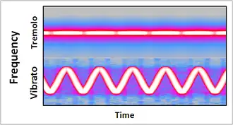 Los términos vibrato y trémolo a veces se utilizan indistintamente aunque las estrictas definiciones de cada uno de ellos los describen como efectos distintos. El vibrato es una variación periódica en la altura (frecuencia) de una nota musical, lo cual afecta la afinación.[1] Por su parte, el trémolo generalmente hace referencia a variaciones periódicas en la intensidad (volumen o amplitud) de una nota musical.[8]