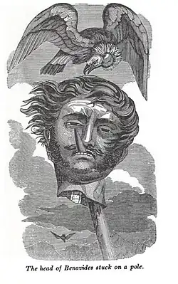 El sábado 23 de febrero, y después de ser nuevamente vejado, Benavides fue finalmente ahorcado en la Plaza de Armas de Santiago de la capital, tras lo cual su cuerpo fue mutilado, conducidas su cabeza, manos y piernas a las ciudades del sur, mientras que el resto fue incinerado en el Llano de Portales, un recinto militar, para eterno tormento del imputado, quien terminaba así su larga carrera de aventuras.
