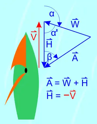 La velocidad del viento aparente es la suma del viento real más el viento de frente percibido por un objeto en movimiento con el aire en calma. La velocidad del viento de frente con el aire en calma es inversa a la velocidad del objeto, por lo tanto el viento aparente también se puede definir como una resta de vectores: Velocidad del viento menos la Velocidad del objeto[2]