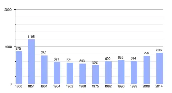 Los datos demográficos contemplados en este gráfico de la comuna de Viessoix[4] se han cogido de 1800 a 1999 de la página francesa EHESS/Cassini, y los demás datos de la página del INSEE.[5]