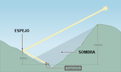 Este fenómeno es paralelo con otro gran espejo reflector, el de Rjukan en Noruega, inaugurado en 2013 según un proyecto ideado un siglo antes, en 1913.