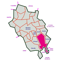- ↑ a b 3745. «Decreto 6/2000, de 7 de enero, por el que se aprueba el nomenclátor correspondiente a las entidades de población de la provincia de Lugo.». Boletín Oficial del Estado n.º 47. España. 24 de febrero de 2000. pp. 8196-8236. Consultado el 25 de abril de 2021.