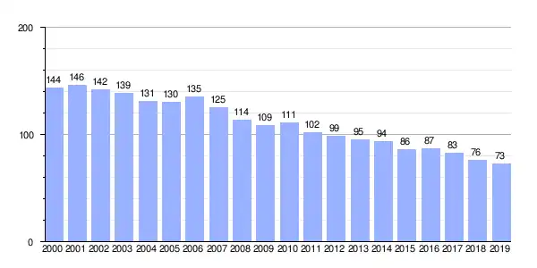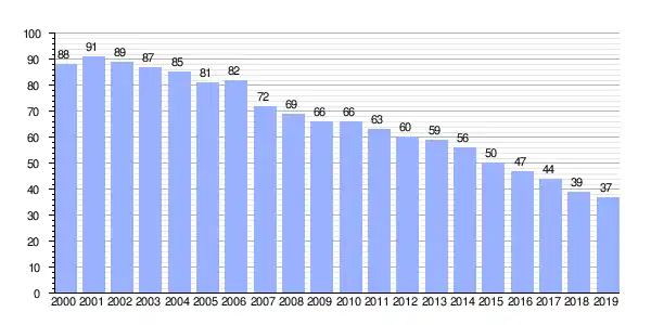 | Gráfica de evolución demográfica de Vilariño (parroquia) entre 2000 y 2019 |