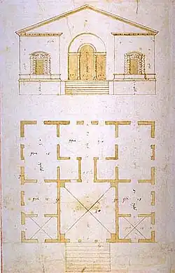 Junto a ellas conviven las sugerencias formales derivadas de las grandes estructuras termales antiguas, conocidas por Palladio en su primer viaje a Roma de 1541, bien reconocibles en la logia, en las estructuras abovedadas de las habitaciones y en la serliana utilizada como filtro frente al ambiente exterior.