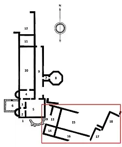 En esta habitación los excavadores apreciaron restos de pinturas murales polícromas donde no pudieron adivinar los temas de la pintura.
