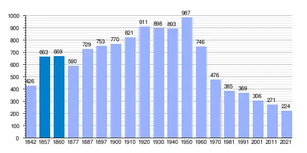 | Gráfica de evolución demográfica de Villalba de la Lampreana[13] entre 1842 y 2021 |