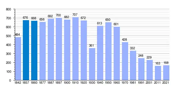 | Gráfica de evolución demográfica de Villalcázar de Sirga[8] entre 1842 y 2021 |