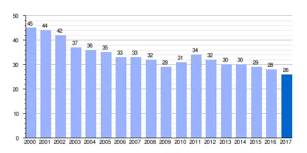 | Gráfica de evolución demográfica de Villamaderne[4] entre 2000 y 2017 |