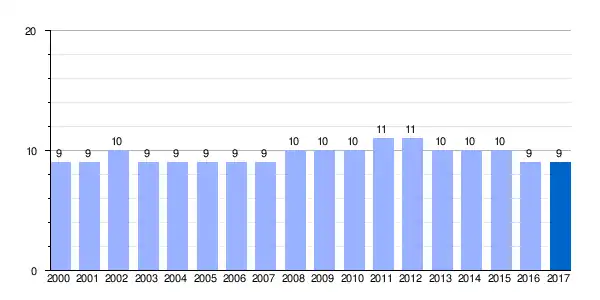 | Gráfica de evolución demográfica de Villamanca[3] entre 2000 y 2017 |