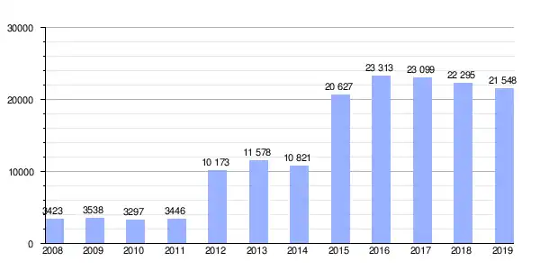 | Gráfica de evolución demográfica de Villamartín[7] entre 1842 y 2021 |