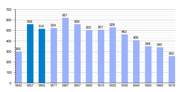 | Gráfica de evolución demográfica de Villamor de Cadozos[15] entre 1842 y 1970 |