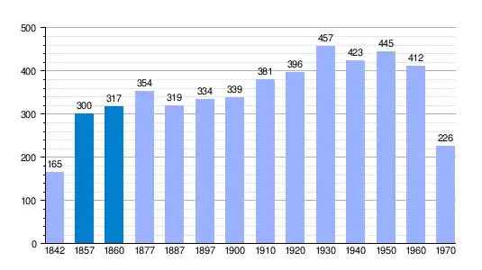 | Gráfica de evolución demográfica de Villanueva de Odra[15] entre 1842 y 1970 |