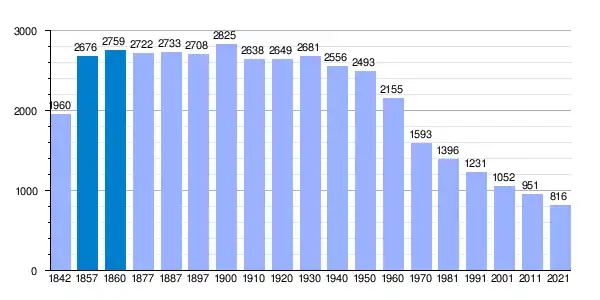 | Gráfica de evolución demográfica de Villanueva del Campo[15] entre 1842 y 2021 |