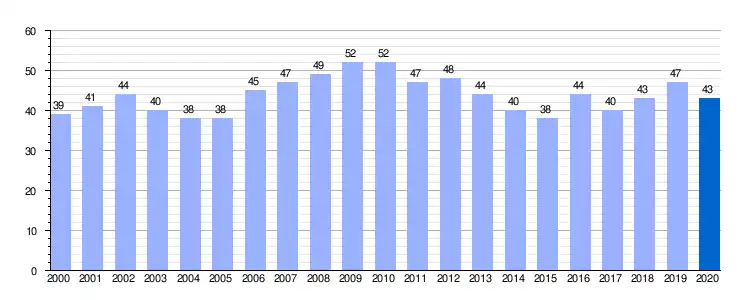 | Gráfica de evolución demográfica de Villarén de Valdivia entre 2000 y 2020 |