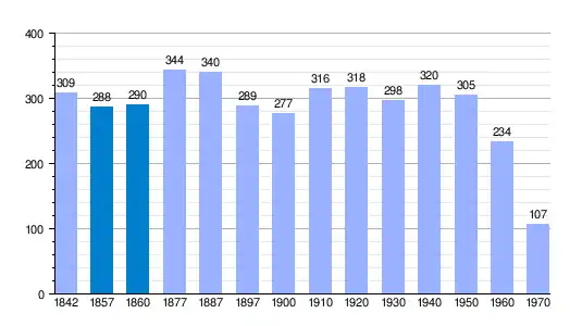 | Gráfica de evolución demográfica de Villarejo Sobrehuerta[2] entre 1842 y 1970 |