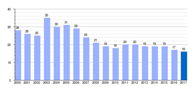 | Gráfica de evolución demográfica de Villarino de Manzanas[8] entre 2000 y 2017 |
