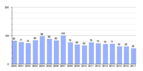 | Gráfica de evolución demográfica de Villarrubín[2] entre 2000 y 2017 |