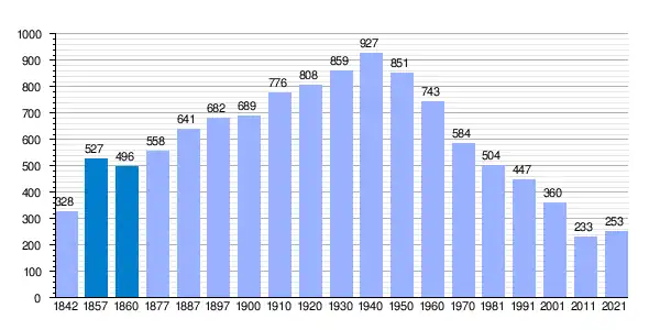 | Gráfica de evolución demográfica de Villasrubias[6] entre 1842 y 2021 |