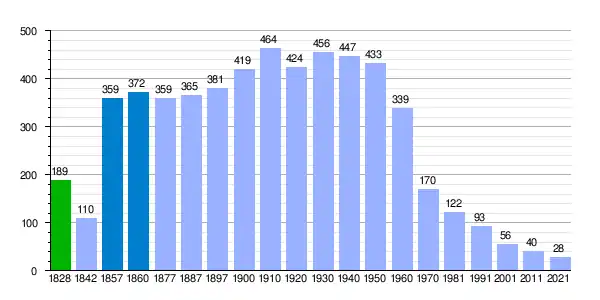 | Gráfica de evolución demográfica de Villaverde de Montejo[5] entre 1828 y 2021 |