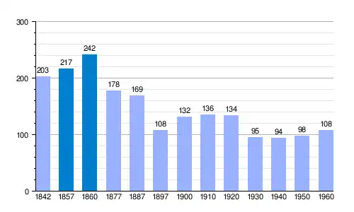 | Gráfica de evolución demográfica de Villaviciosa de Tajuña[6] entre 1842 y 1960 |