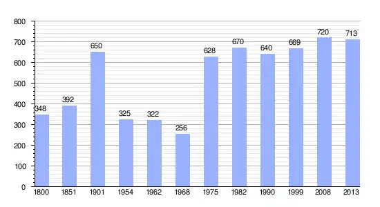 Los datos demográficos contemplados en este gráfico de la comuna de Villegusien-le-Lac[3] se han cogido de 1800 a 1999 de la página francesa EHESS/Cassini, y los demás datos de la página del INSEE.[4]