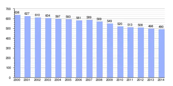 | Gráfica de evolución demográfica de Villoria de Órbigo[2] entre 2000 y 2014 |