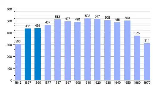 | Gráfica de evolución demográfica de Villovela de Esgueva[6] entre 1842 y 1970 |