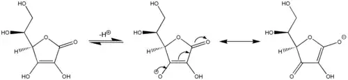 La reactividad viníloga se explica generalmente por deslocalización de los electrones en un sistema conjugado, donde los electrones π del enlace doble son compartidos con el par electrónico o electrones π del grupo atractor de electrones. Por ejemplo, el ácido ascórbico (vitamina C) se comporta como un ácido carboxílico vinílogo, con un enlace doble carbonílico, un enlace doble ("vinilo"), y el par libre en el grupo hidroxilo actuando como un sistema conjugado. El protón hidroxílico en el ácido ascórbico es inusualmente ácido, comparado con un grupo hidroxilo típico, debido a que dos estructuras en resonancia importantes estabilizan la carga negativa en la base conjugada del ácido ascórbico.