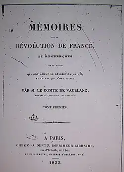 - Memorias de Vincent-Marie Viénot, conde de Vaublanc: Mémoires sur la Révolution de France et recherches sur les causes qui ont amené la Révolution de 1789 et celles qui l'ont suivie] (4 volumes), Chez G-A. Dentu, imprimeur-libraire, rue d'Erfurth, n 1 bis, Paris, 1833. Texto en línea en Gallica. [10], [11] y [12]