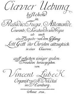 - Clavier Übung bestehend im Praeludio, Fuga, Allemande, Courante, Sarabande und Gigue als auch einer Zugabe von dem Gesang Lobt Gott ihr Christen allzugleich in einer Chaconne (Hamburgo, 1728):