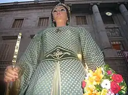 En Borjas Blancas, también encontramos una gigante que representa a la misma reina. Esta lleva un escudo de la dinastía Árpád en la parte de la cintura.
