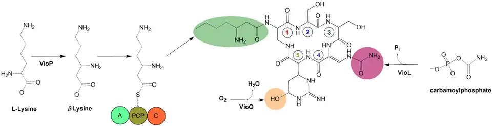 El siguiente es el mecanismo de biosíntesis propuesto para la viomicina utilizando la síntesis peptídica catalizada por la NRPS. Hay cinco dominios proteicos responsables de la síntesis del pentapéptido, incluyendo uno que carece de un dominio de adenilación (A). Por lo cual se ha propuesto que otro de los sitos de adenilación es capaz de funcionar dos veces. Adicionalmente, se sospecha que las subunidades de la NRPS no funcionan en el orden en que se encuentran codificadas sobre el arreglo de genes, una característica de la biosíntesis de la viomicina que es muy diferente a otras síntesis típicas de péptidos catalizadas por NRPS.[4] Los componentes de la NRPS funcionan en el orden VioA→VioI→VioF→VioG para poder llevar a cabo la incorporatción de β-ureidoalanina (β-Uda). El primer dominio A de la VioA crea un intermediario L-Dap-PCP en el primer dominio PCP. Mientras tanto, el segundo dominio A de VioA carga una L-Ser en el segundo dominio PCP, como así también el PCP de VioI. La activación de la β-Uda ocurre vía VioF, y la VioG incorpora a la L-Cam.