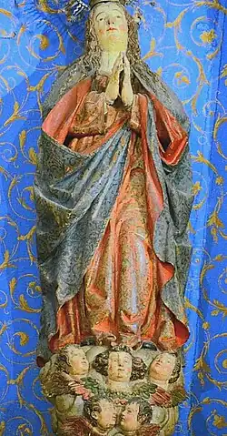 La imagen, la cual preside el retablo mayor (obra de José Arroyo en el siglo xvii y decorado en 1633 por Felipe Gil de Mena),[7] representa a la Virgen de pie con los brazos doblados y las manos juntas en actitud orante, erigida sobre una peana de piedras y gallones con figuras angelicales y la cabeza levantada con la vista dirigida al cielo. La base, algo arcaica acorde a los cánones del primer tercio del siglo xvii, se compone de una nube con los rostros alados de cinco serafines. Viste túnica bermellón y manto azul cruzado sobre el pecho, ambos con estampado y dotados de pliegues descritos por Martín González como abultados, claroscuristas, armoniosos y simétricos,[6]: 31 estando caracterizados por su sequedad y rigidez, nada acorde a la iconografía típica de las imágenes asuncionistas, las cuales acostumbran lucir pañería muy movida simulando la subida de la Virgen a los cielos. Este rasgo, junto con la posición orante de las manos, hace que esta pieza se halle más próxima a las imágenes concepcionistas que a las asuncionistas; ya en 1959 Martín González la identificó como una Inmaculada, aunque sin citar al autor además de encuadrarla en la década de 1630.[6]: 31 Respecto al rostro, Baladrón Alonso lo vincula con otras representaciones femeninas de Tudanca, como por ejemplo la María Magdalena de El Descendimiento (1663), conjunto escultórico ubicado en Medina de Rioseco, señalando a su vez una calidad muy superior en comparación con la mayoría de sus obras gracias a lo detallado de los rasgos faciales así como de los mechones que caen sobre el manto.[2]: 16