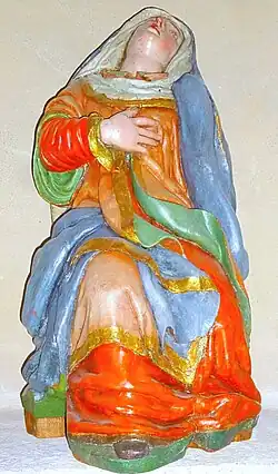 La Virgen, emplazada en uno de los nichos laterales del presbiterio de la capilla,[2] aparece sentada en una roca con una disposición ligeramente helicoidal del cuerpo con el fin de remarcar el grado de ansiedad producto del estado de trance en el que se encuentra sumida. La pierna derecha se halla flexionada y hacia delante mientras que la izquierda está doblada hacia atrás, gesto que provoca un leve arqueamiento del tronco hacia el lado izquierdo, con el hombro de este lado adelantado respecto al otro. La disposición de ambas piernas guarda consonancia en cierta forma con los brazos ya que el derecho se apoya en el pecho en señal de desconsuelo mientras que el izquierdo se halla estirado hacia la parte posterior y cubierto por el manto, con la mano parcialmente tapada a imagen y semejanza de la talla de Juni, quien tenía por costumbre cubrir partes anatómicas con pañería, destacando en este aspecto diversas obras: la María Magdalena del Santo Entierro (1541-1544) del Museo Nacional de Escultura; la Virgen de la Esperanza (c. 1550) de la Iglesia de Santiago de Allariz; el relieve de la Virgen de la Piedad (1550-1560) del retablo de la Capilla de los Alderete en la Iglesia museo de San Antolín de Tordesillas; el San Juan del Calvario de Ciudad Rodrigo (1556-1557) del Museo Nacional de Escultura; y la María de Cleofás del Santo Entierro (1566-1571) de la Catedral de Segovia.[7]