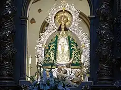 ![]() Nuestra Señora de los Ángeles de Getafe en su carroza, a la puerta de la ermita del Cerro de los Ángeles | ||
