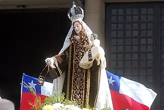 La advocación mariana de la Virgen del Carmen (también llamada Chinita, Madre de Chile, Augusta patrona de Chile, Reina de Chile, Reina del Tamarugal o simplemente Carmelita) es una tradición católica traída desde España a América en 1595[1] (o 1680)[2] por los frailes agustinos, quienes trasladaron consigo la primera imagen.[1] Durante el proceso de emancipación nacional, la figura fue instaurada históricamente como la «Patrona de Chile».[3] José de San Martín, general del Ejército Libertador, proclamó que la Virgen del Carmen recibía el título de «Patrona del Ejército de los Andes» y Bernardo O'Higgins la denominó como «Patrona y General de las Armas Chilenas» en las vísperas de la batalla de Chacabuco.[4]