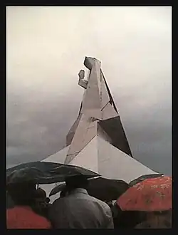 Soporte: Avanza como o sobre una estrella, la estrella de la mañana en la iconografía religiosa. Sus tres metros de altura son una expresión trinitaria, lo mismo que el santuario figurativamente conseguido con el triángulo concerniente a una representación geométrica perfecta e indeformable.