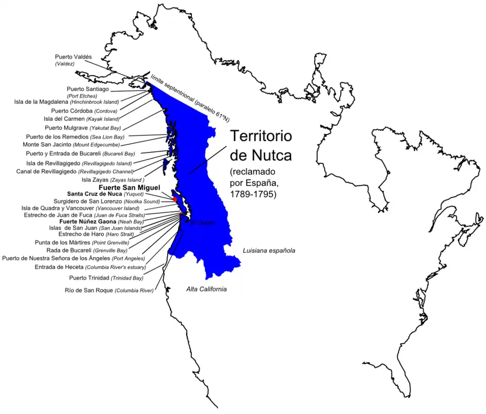 ![]() Mapa de todos los territorios que alguna vez pertenecieron al Virreinato de Nueva España solo en verde oscuro. En verde claro territorio reclamado sin soberanía alguna, y en disputa con el Reino de Gran Bretaña. | ||||||||||||||||||||||||||||||||||||||||||||||||||||||||||||||||||||||||||||||||||