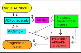 | Replicación del genoma: | ADNbc → ARNmc+ → ARN/ADN → ADNbc |