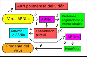 | Enzimas: | ARN polimerasas aportadas o codificadas por el virus: ARNbc → ARNm, ARNbc → ARNmc+, ARNmc+ → ARNbc |