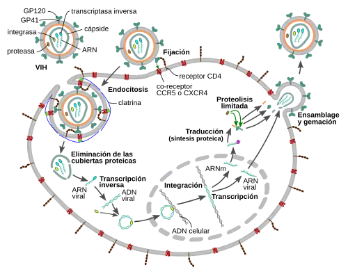 El virus de la inmunodeficiencia humana (VIH) es un lentivirus (un género de la familia retrovirus) que causa la infección por VIH.[1]Se trata de un virus que, en promedio, en 10 años en países desarrollados o en 5 años en países con deficiente salud pública, provoca el desarrollo del síndrome de inmunodeficiencia adquirida (sida),[2][3] una enfermedad que progresa hacia el fallo del sistema inmune, lo que permite que se desarrollen infecciones oportunistas y cánceres potencialmente mortales, cuando los niveles de linfocitos T CD4+ están por debajo de 200 por mililitro. Sin tratamiento, se estima que el promedio de supervivencia después de la infección de VIH es de nueve a once años, dependiendo del subtipo de VIH.[4] La infección por VIH ocurre únicamente a través de los siguientes fluidos de las personas infectadas: sangre, semen, flujo vaginal, líquido preseminal y leche de lactancia. Dentro de estos fluidos corporales, el VIH está presente como partículas libres y como virus dentro de células inmunes infectadas.[cita requerida]