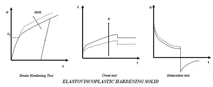 Estos modelos se pueden aplicar a metales y aleaciones a temperaturas superiores a dos tercios[20] de su punto de fusión absoluto (en kelvins) y a polímeros y asfalto a temperatura elevada. Las respuestas para las pruebas de endurecimiento por deformación, fluencia y relajación de dicho material se muestran en la figura adjunta.
