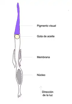 Cada cono de un ave o un reptil contiene una pequeña gota de aceite coloreada; éstas no existen en mamíferos. Las gotitas, que contienen concentraciones altas de carotenoides , están ubicadas de forma que la luz les pase a través antes de alcanzar el pigmento visual. Ellas actúan como filtros, eliminando algunas longitudes de ondas y estrechando el espectro de absorción de los pigmentos. Esto reduce la superposición de respuestas entre los pigmentos e incrementa el número de colores que un ave puede discernir.[16] Se han identificado seis tipos de gotitas de aceite de los conos; cinco de estos tienen mezclas de carotenoides que absorben a diferentes longitudes de ondas e intensidades, y el sexto tipo no tiene pigmentos.[20]