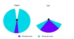 Estudios de comportamiento muestran que muchas especies de aves enfocan los objetos lejanos preferentemente con su campo de visión lateral y monocular (con un solo ojo), y orientan la cabeza para ver por un lado y maximizar la resolución visual. Para una paloma, la resolución es el doble más fina con la visión monocular de lado que con la visión binocular frontal, mientras que en los humanos ocurre lo contrario.[1]